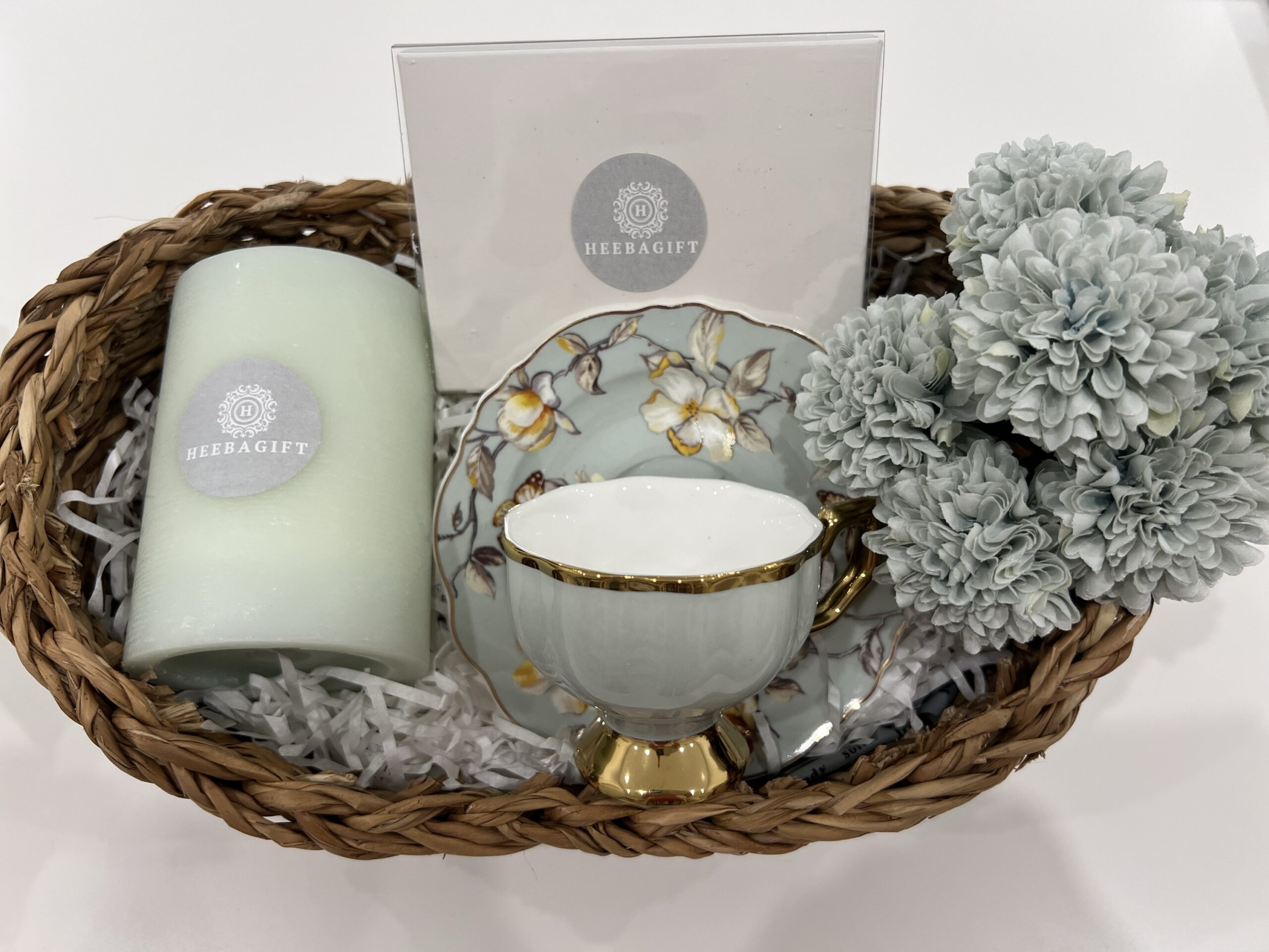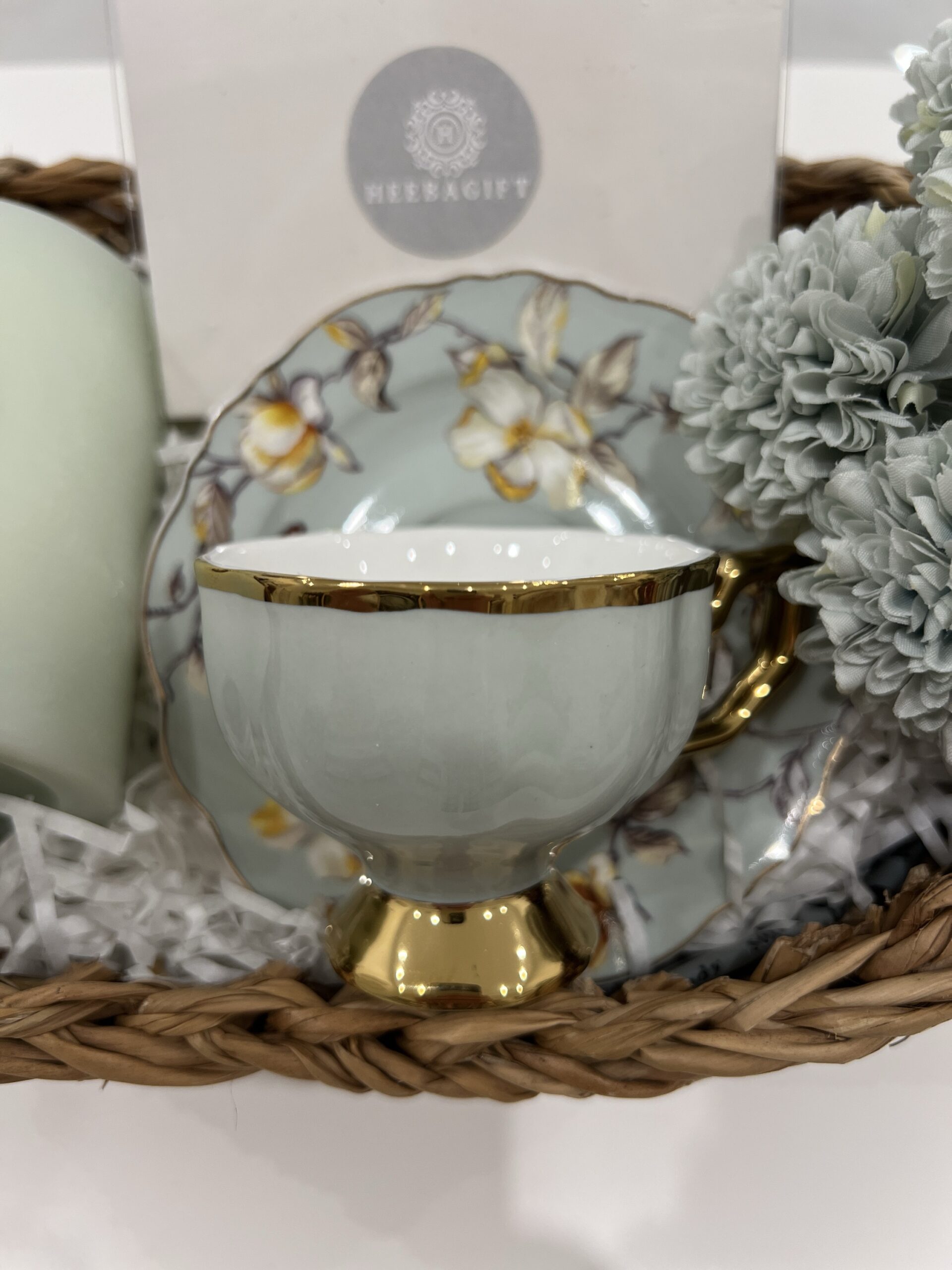 هدية تتضمن فنجان قهوة كلاسيكي + شمعة معطرة +علبة چوكليت+ باقة ورد
