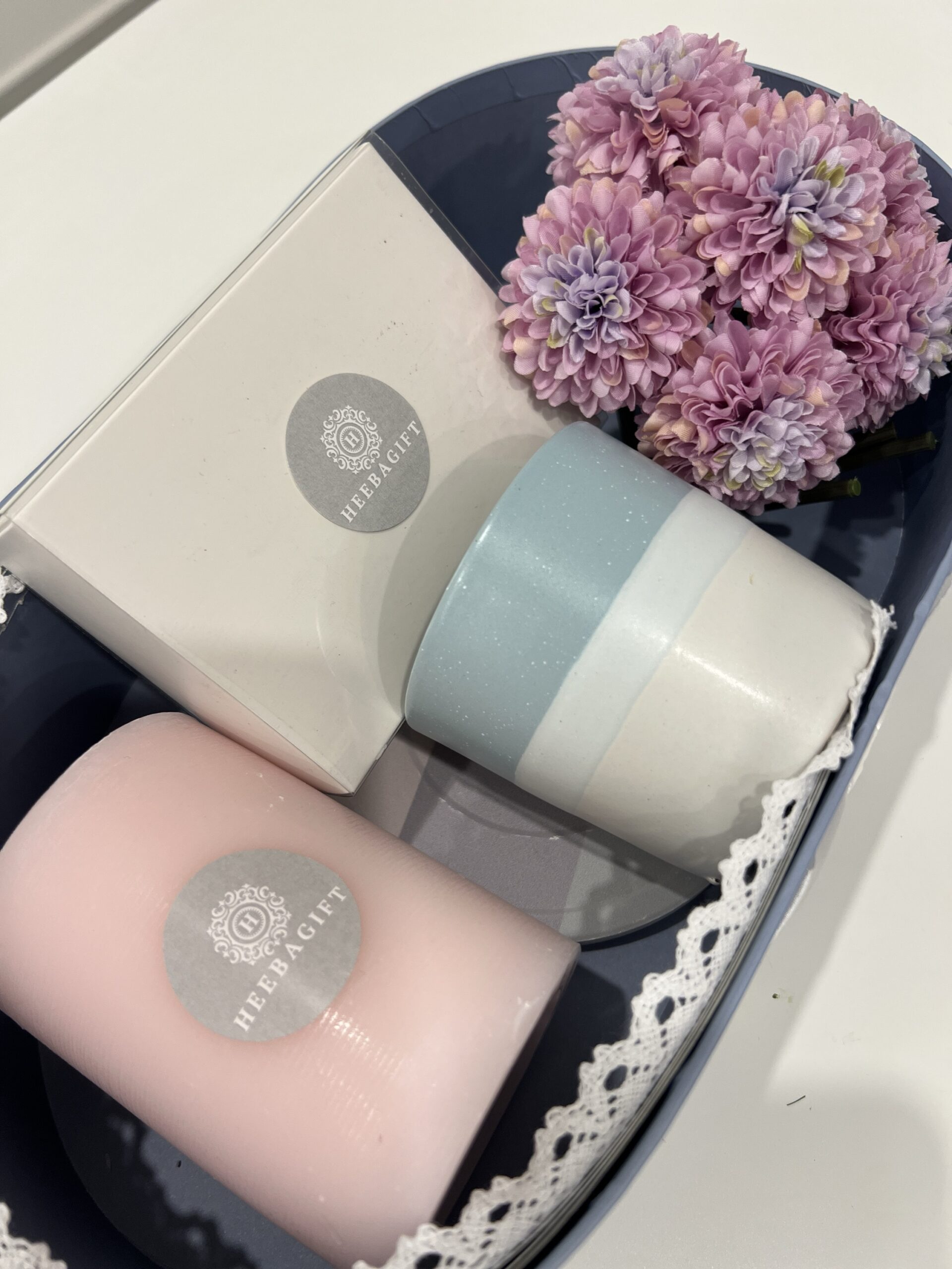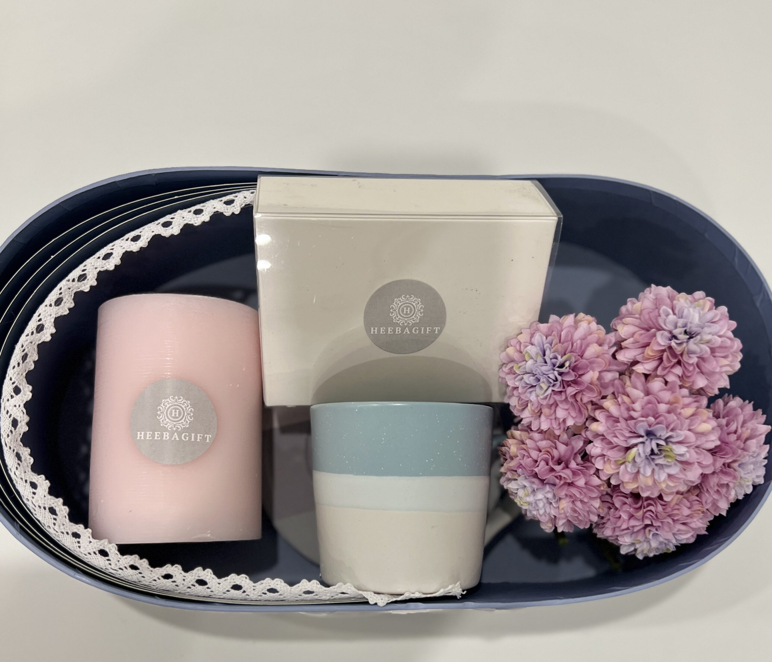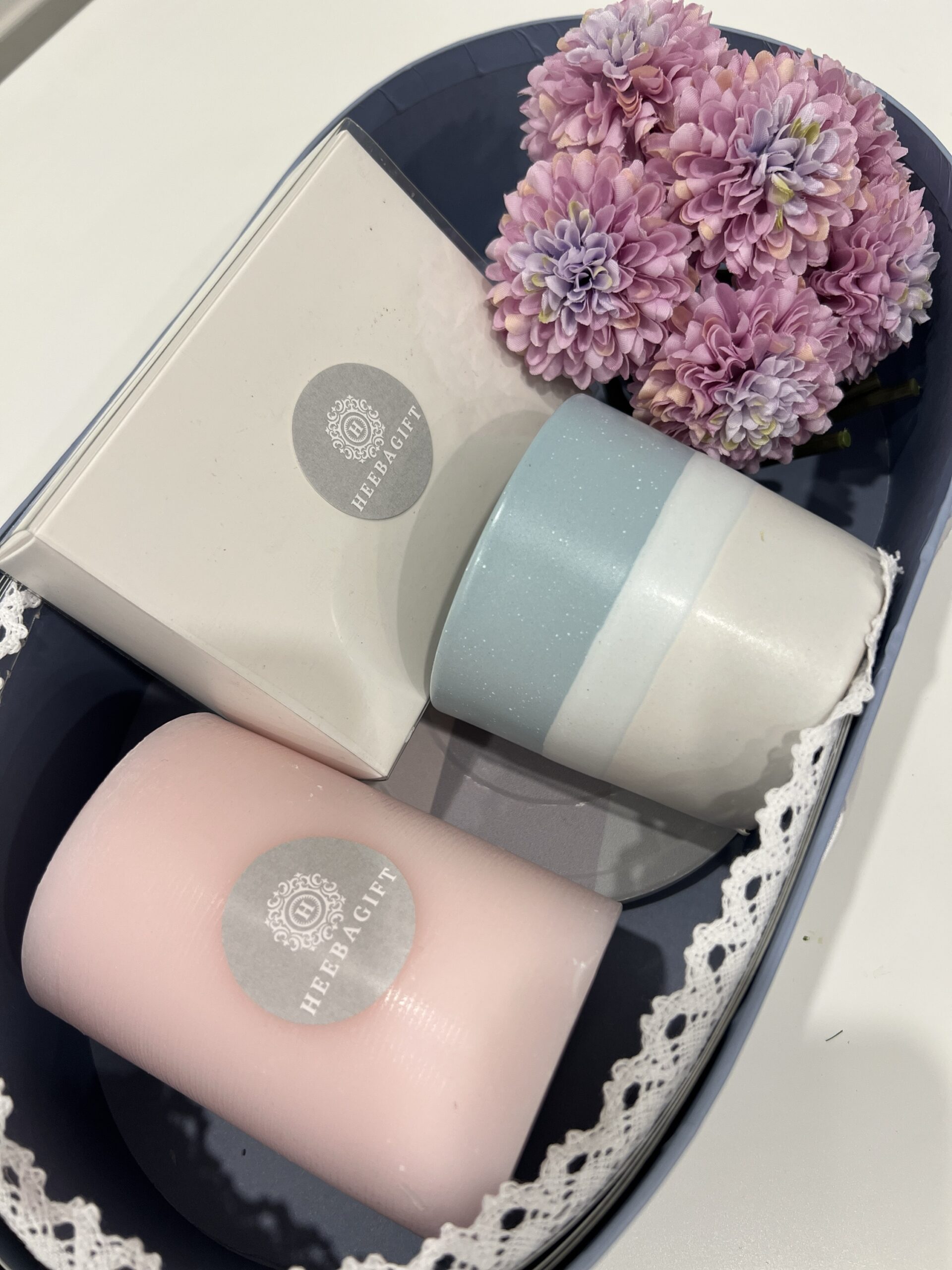 هدية تحتوي على كوب شاي راقي باللون السماوي و شمعة معطره بالياسمين ، علبة چوكليت بلجيكي،باقة ورد ناعمة