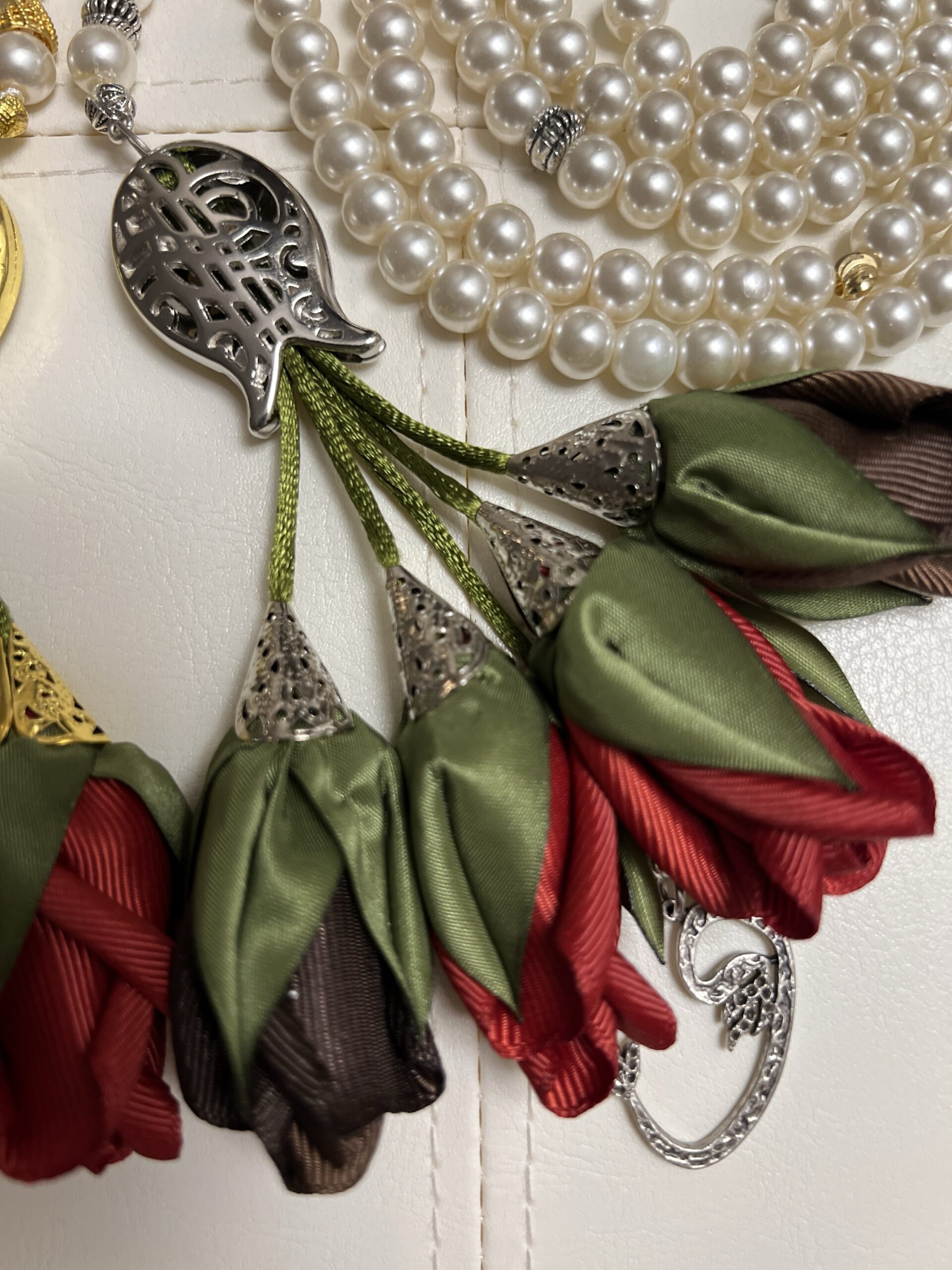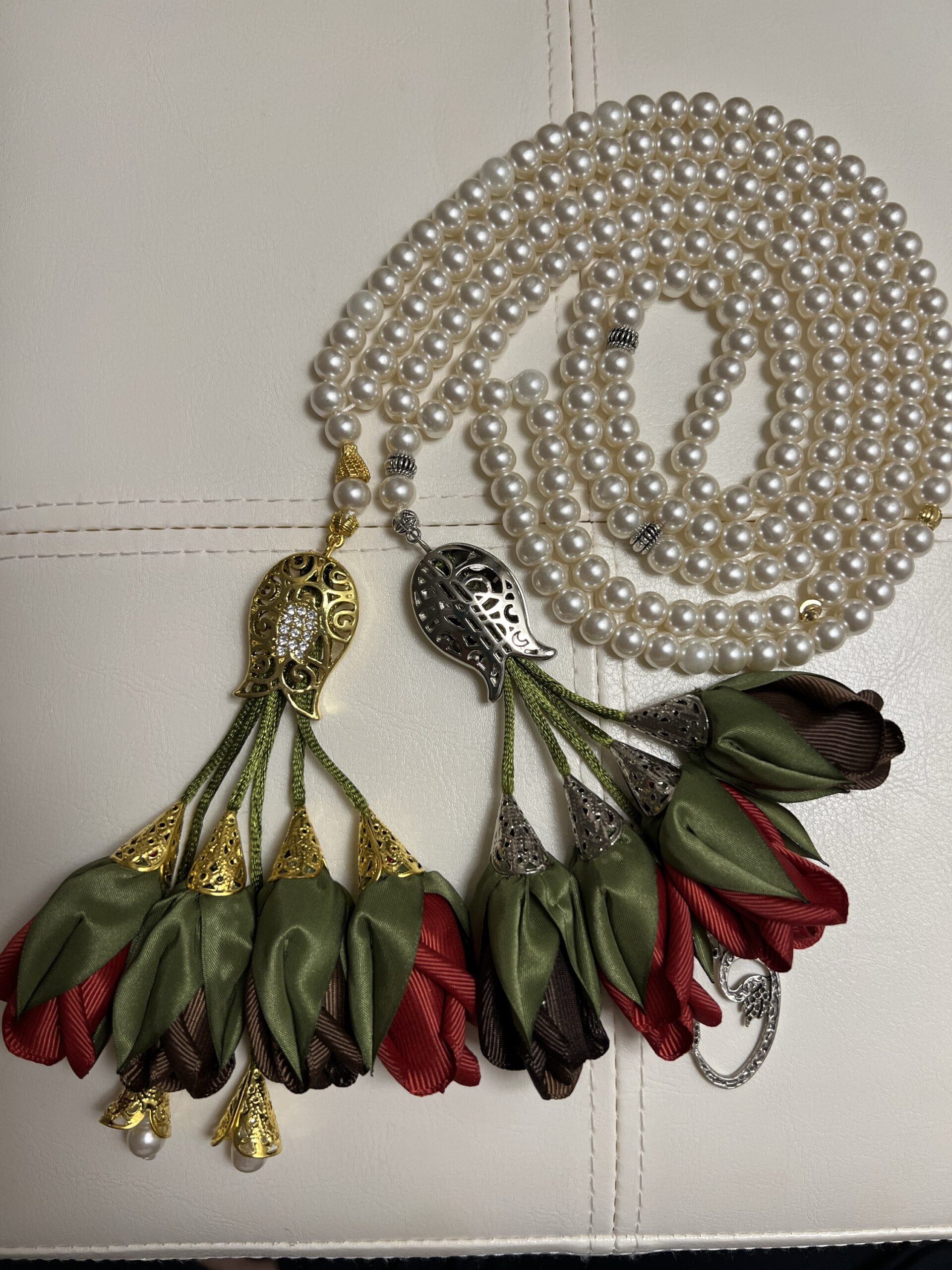 Be the first to review “مسباح من اللولو الأبيض الصناعي مع ورد الأحمر”