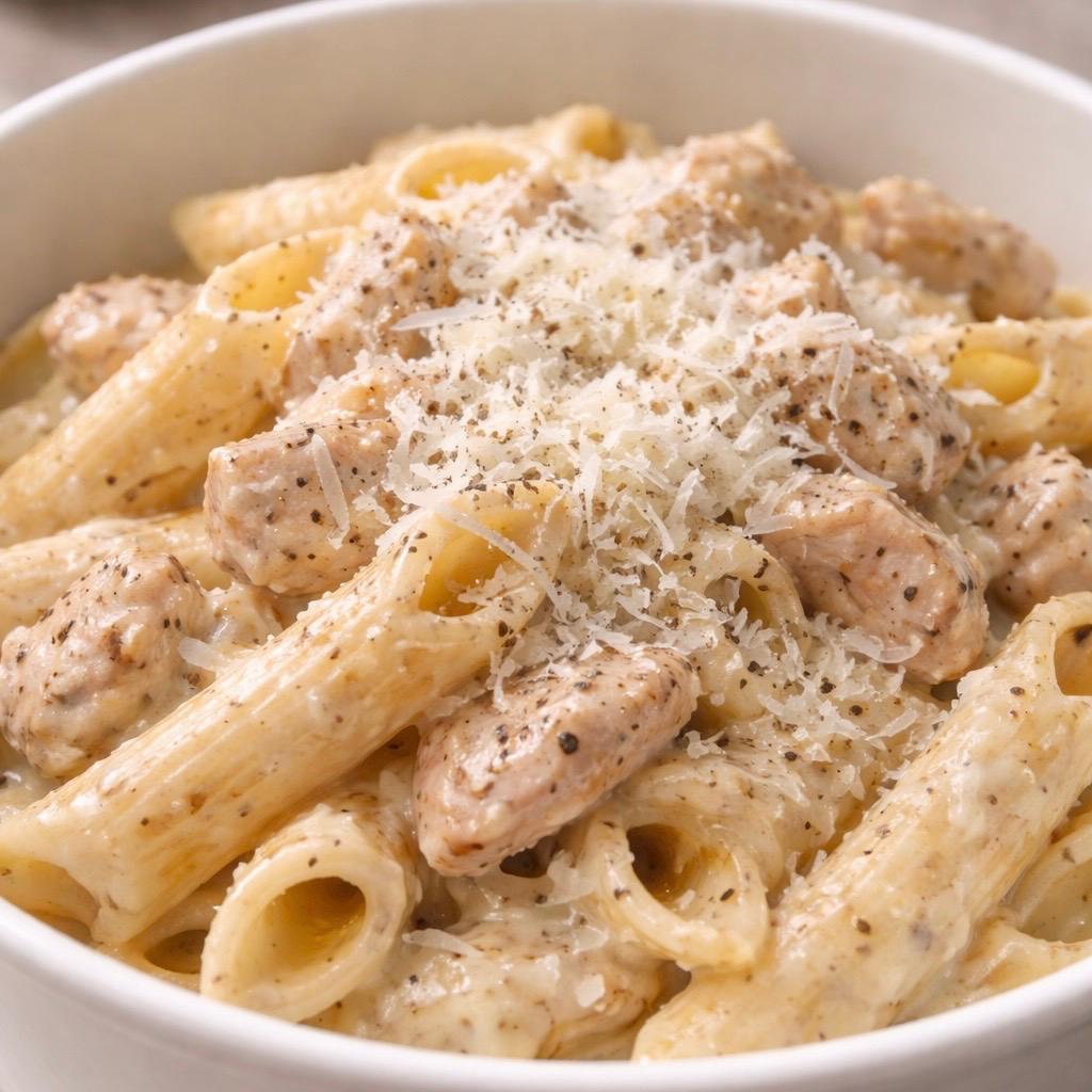 إيطالية شهية وسريعة تجمع بين المعكرونة، قطع الدجاج الطرية، وصلصة البيستو الخضراء الغنية بالريحان والثوم وجبنة البارميزان، مع إضافة كريمة لجعلها أكثر دسمًا ونكهة، وتُقدم ساخنة ومزينة بالجبن الإضافي